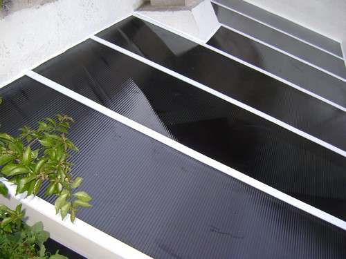Este tipo de techos consiste en una estructura de aluminio en donde se apoya una placa de policarbonato alveolar (pequeñas celdas longitudinales) el cual cuenta con filtro ultra-violeta y cuyas celdas sirven como aislante térmico.